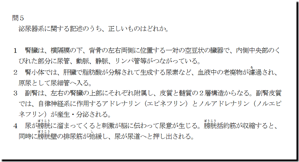 本問は、「人体」の「泌尿器系」についての問題です。基礎・基本的なものばかりなので、難しいところはありません。テキストと過去問を繰り返しておけば、まず、取れます。