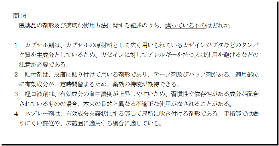 本問は、「人体」の「剤形」の問題です。基礎・基本的なものばかりなので、難しいところはありません。テキストと過去問を繰り返しておけば、まず、取れます。