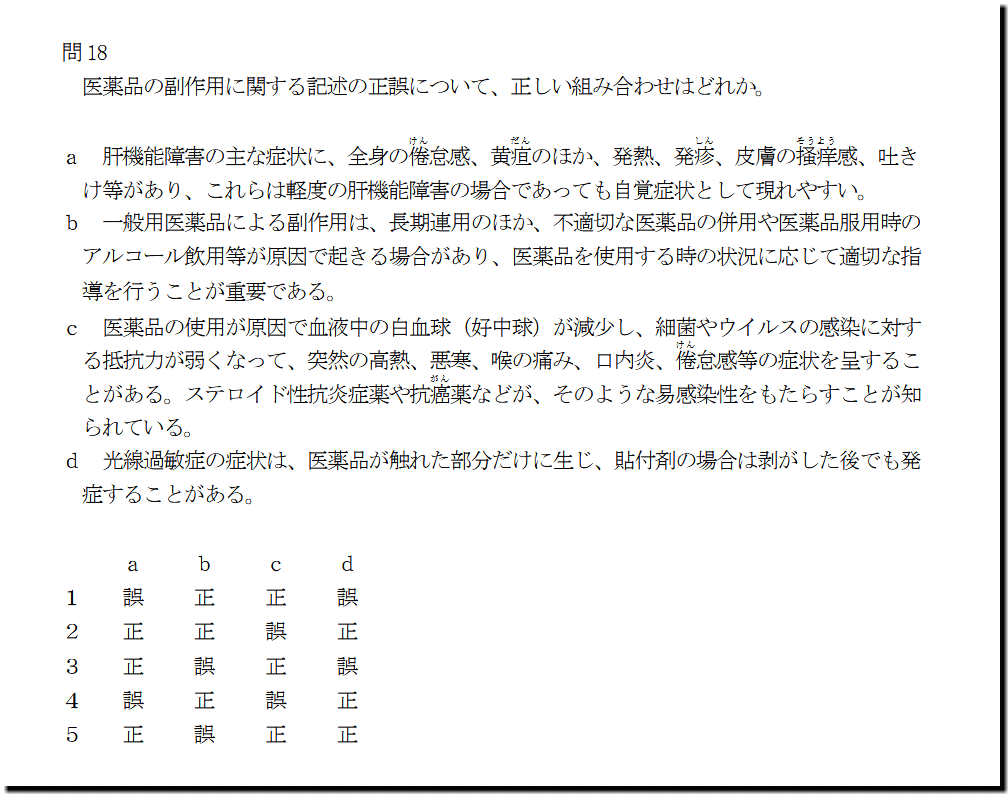 本問は、「人体」の「医薬品の副作用」についての問題です。基礎・基本的なものばかりなので、難しいところはありません。テキストと過去問を繰り返しておけば、まず、取れます。