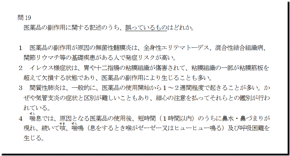 本問は、「人体」の「医薬品の副作用2」についての問題です。基礎・基本的なものばかりなので、難しいところはありません。テキストと過去問を繰り返しておけば、まず、取れます。