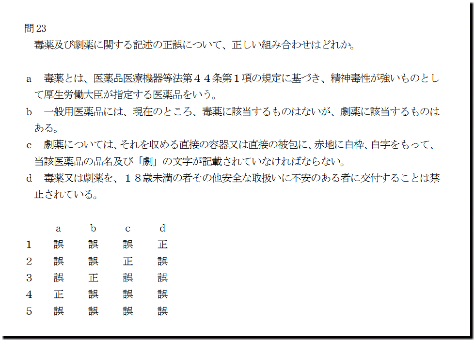 本問は、「法規」の「毒薬及び劇薬」の問題です。基礎・基本的なものばかりなので、難しいところはありません。テキストと過去問を繰り返しておけば、まず、取れます。