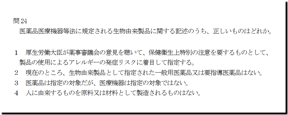 本問は、「法規」の「生物由来製品」についての問題です。基礎・基本的なものばかりなので、難しいところはありません。テキストと過去問を繰り返しておけば、まず、取れます。
