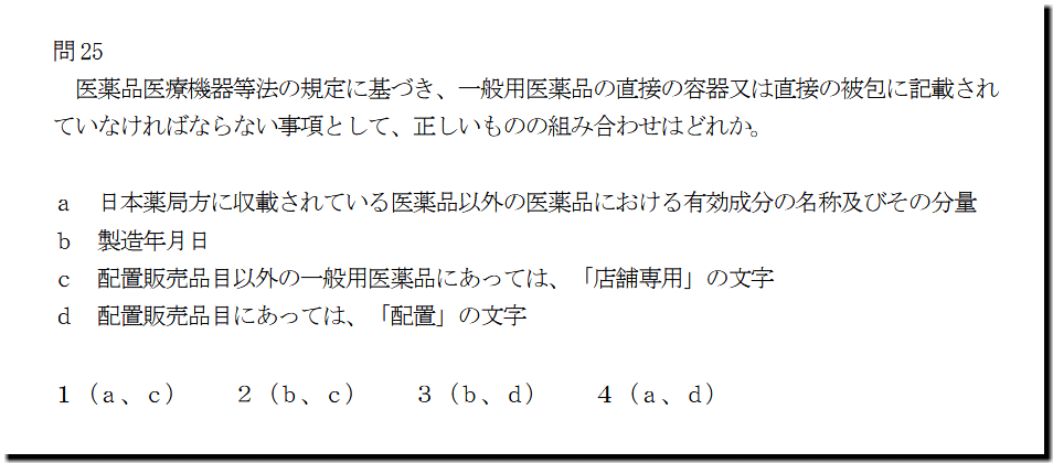 本問は、「法規」の「容器被包記載事項」についての問題です。基礎・基本的なものばかりなので、難しいところはありません。テキストと過去問を繰り返しておけば、まず、取れます。