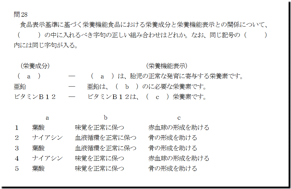 答えは、「1」です。 栄養成分) (栄養機能表示) ( a ) ― ( a )は、胎児の正常な発育に寄与する栄養素です。 亜鉛 ― 亜鉛は、( b )のに必要な栄養素です。 ビタミンB12 ― ビタミンB12は、( c )栄養素です。 a b c 2 ナイアシン 血液循環を正常に保つ 骨の形成を助ける 3 葉酸 血液循環を正常に保つ 骨の形成を助ける 4 ナイアシン 味覚を正常に保つ 赤血球の形成を助ける 5 葉酸 味覚を正常に保つ 骨の形成を助ける 1