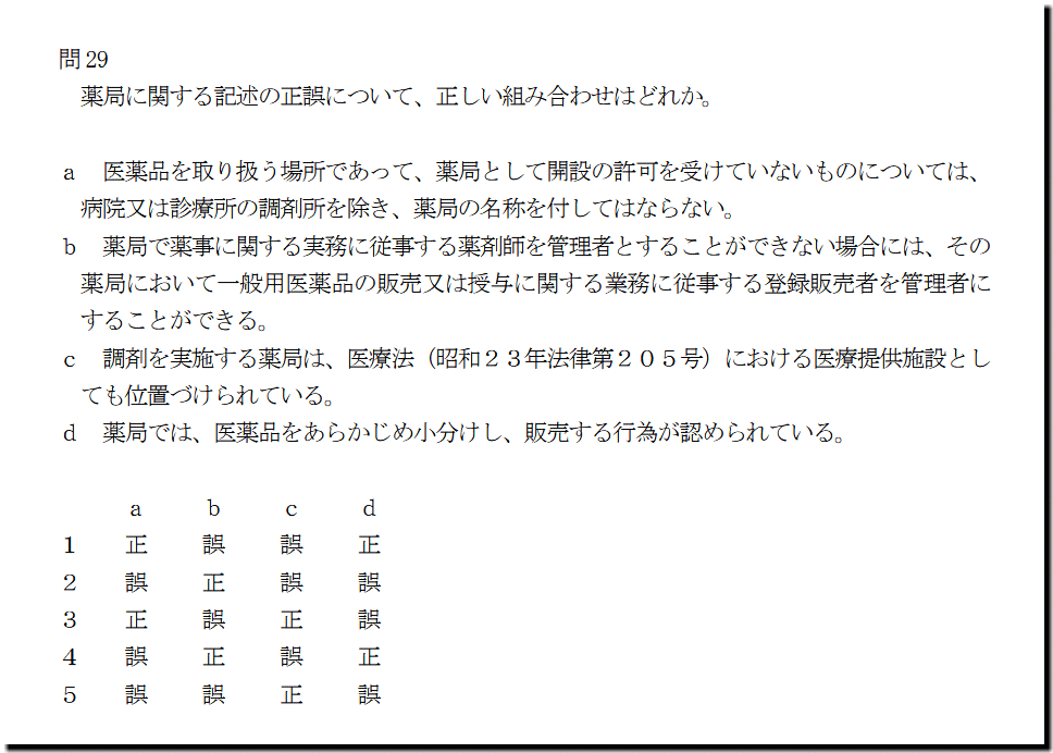 本問は、「法規」の「薬局」についての問題です。難しいところはありません。基礎・基本事項の出題です。