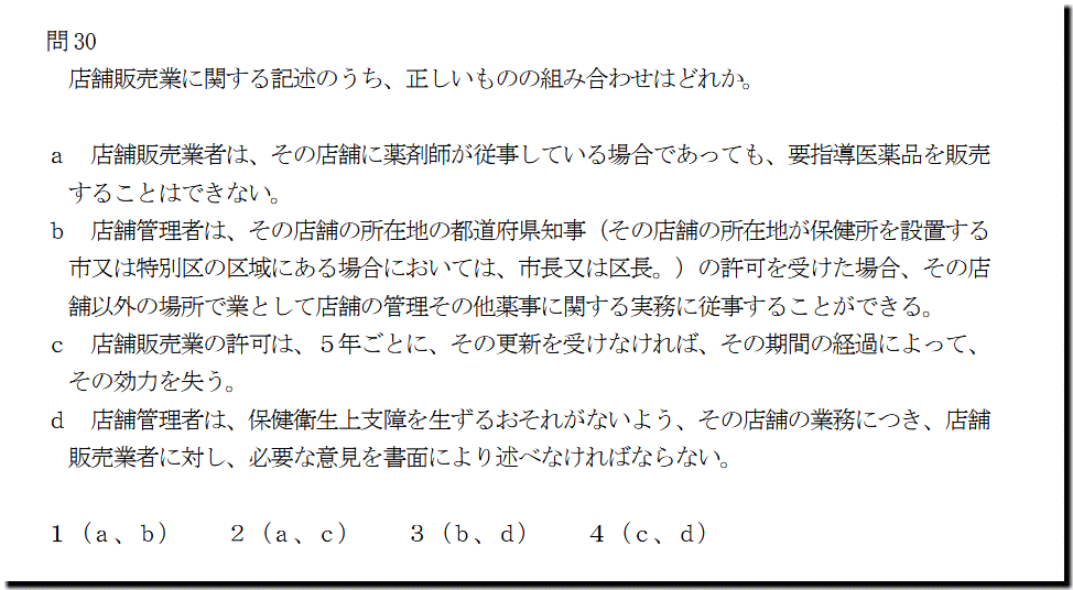 本問は、「法規」の「店舗販売業」についての問題です。難しいところはありません。基礎・基本事項の出題です。