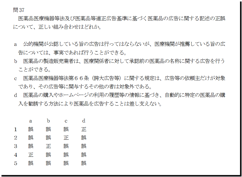 選択肢dの「医薬品の購入やホームページの利用の履歴等の情報に基づき、自動的に特定の医薬品の購 入を勧誘する方法により医薬品を広告することは差し支えない」ですが、誤った記述です。