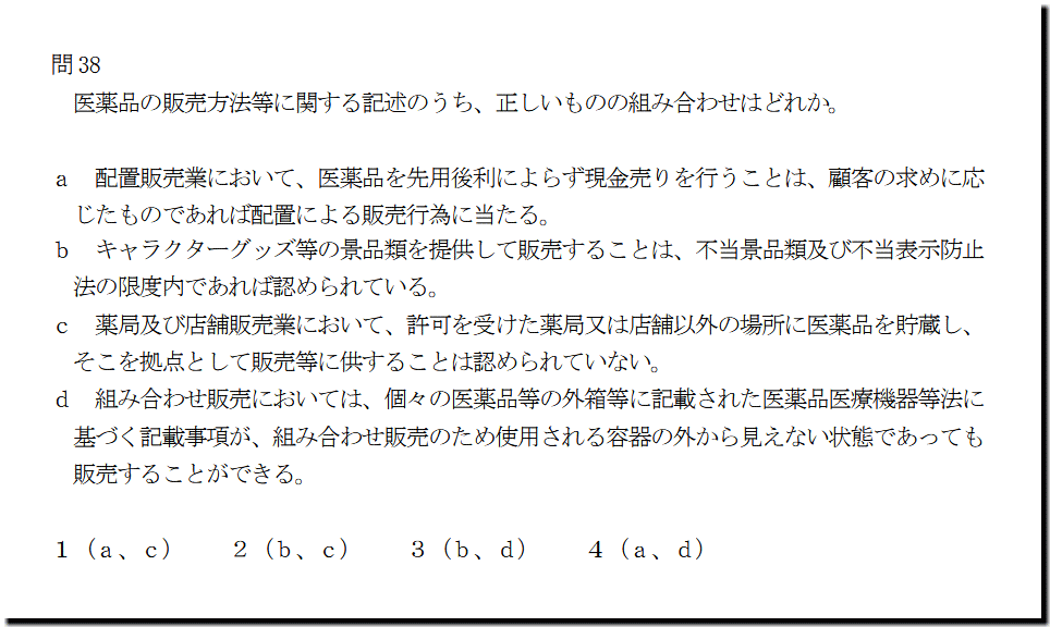 選択肢dの「組み合わせ販売においては、個々の医薬品等の外箱等に記載された医薬品医療機器等法に 基づく記載事項が、組み合わせ販売のため使用される容器の外から見えない状態であっても 販売することができる。」ですが、誤った記述です。
