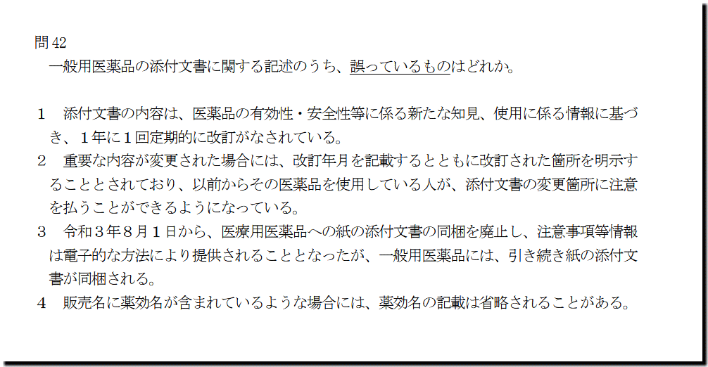 選択肢3の「令和3年8月1日から、医療用医薬品への紙の添付文書の同梱を廃止し、注意事項等情報 は電子的な方法により提供されることとなったが、一般用医薬品には、引き続き紙の添付文 書が同梱される。 」ですが、正しい記述です。