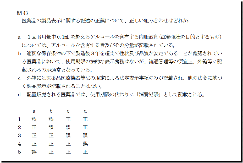選択肢bの「適切な保存条件の下で製造後3年を超えて性状及び品質が安定であることが確認されてい る医薬品において、使用期限の法的な表示義務はないが、流通管理等の便宜上、外箱等に記 載されるのが通常となっている。」ですが、正しい記述です。