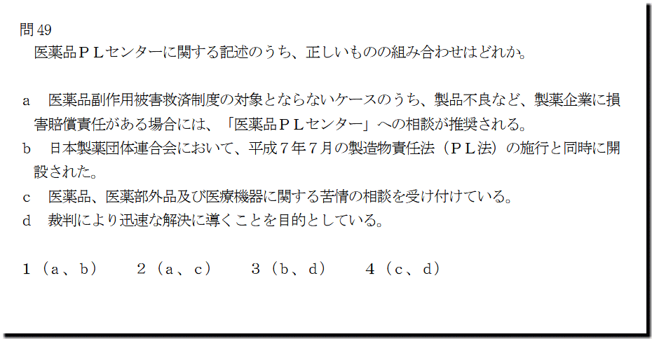 選択肢bの「日本製薬団体連合会において、平成7年7月の製造物責任法(PL法)の施行と同時に開 設された。」ですが、正しい記述です。
