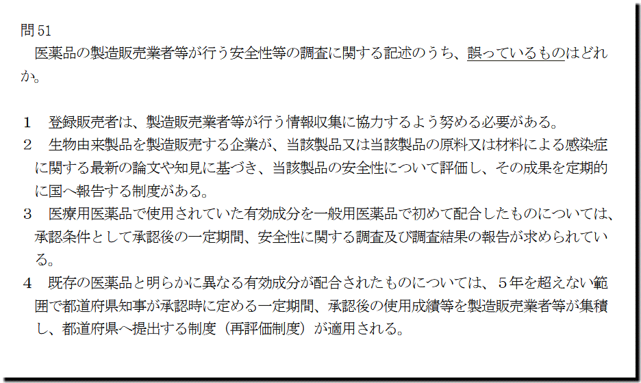 選択肢4の「既存の医薬品と明らかに異なる有効成分が配合されたものについては、5年を超えない範 囲で都道府県知事が承認時に定める一定期間、承認後の使用成績等を製造販売業者等が集積 し、都道府県へ提出する制度(再評価制度)が適用される 」ですが、誤った記述です。