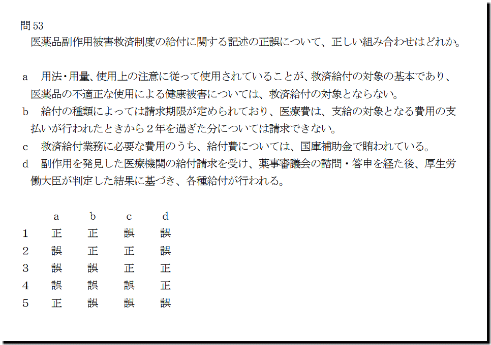 選択肢dの「副作用を発見した医療機関の給付請求を受け、薬事審議会の諮問・答申を経た後、厚生労 働大臣が判定した結果に基づき、各種給付が行われる。」ですが、誤った記述です。