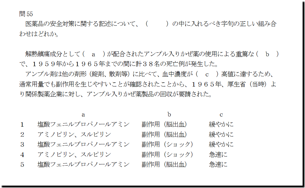 なお、本問の解答は、こちら(数字のみ)です。 解熱鎮痛成分として( a )が配合されたアンプル入りかぜ薬の使用による重篤な( b ) で、1959年から1965年までの間に計38名の死亡例が発生した。 アンプル剤は他の剤形(錠剤、散剤等)に比べて、血中濃度が( c )高値に達するため、 通常用量でも副作用を生じやすいことが確認されたことから、1965年、厚生省(当時)よ り関係製薬企業に対し、アンプル入りかぜ薬製品の回収が要請された。 a b c 1 塩酸フェニルプロパノールアミン 副作用(脳出血) 緩やかに 2 アミノピリン、スルピリン 副作用(脳出血) 緩やかに 3 塩酸フェニルプロパノールアミン 副作用(ショック) 緩やかに 4 アミノピリン、スルピリン 副作用(ショック) 急速に 5 塩酸フェニルプロパノールアミン 副作用(脳出血) 急速に 4