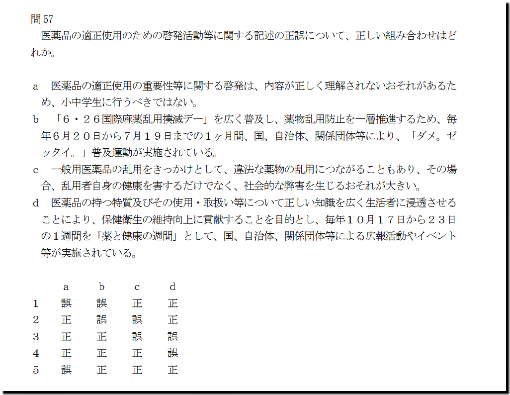 本問は、「適正使用」の「啓発活動」についての問題です。基礎・基本的なものばかりなので、難しいところはありません。テキストと過去問を繰り返しておけば、まず、取れます。