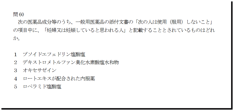 答えは、「3 オキセサゼイン」です。 次の医薬品成分等のうち、一般用医薬品の添付文書の「次の人は使用(服用)しないこと」 の項目中に、「妊婦又は妊娠していると思われる人」と記載することとされているものはどれ か。 1 プソイドエフェドリン塩酸塩 2 デキストロメトルファン臭化水素酸塩水和物 4 ロートエキスが配合された内服薬 5 ロペラミド塩酸塩 3
