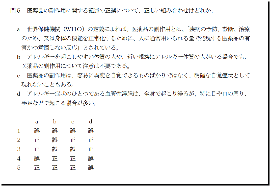 第5問は、「基本知識」の「医薬品の副作用 」の問題です。テキストを精読し、過去問演習を繰り返していれば、まず、解ける問題です。貴重な1点を確保です。