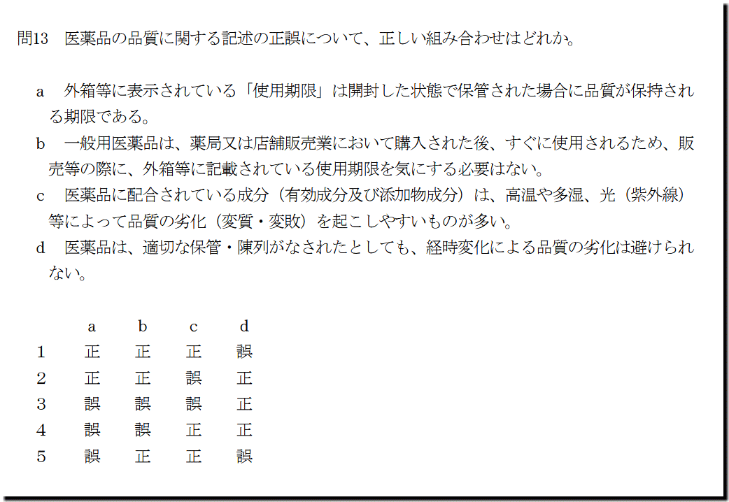 本問は、「基本知識」の「医薬品の品質」についての出題です。基礎・基本的なものばかりなので、難しいところはありません。テキストと過去問を繰り返しておけば、まず、取れます。