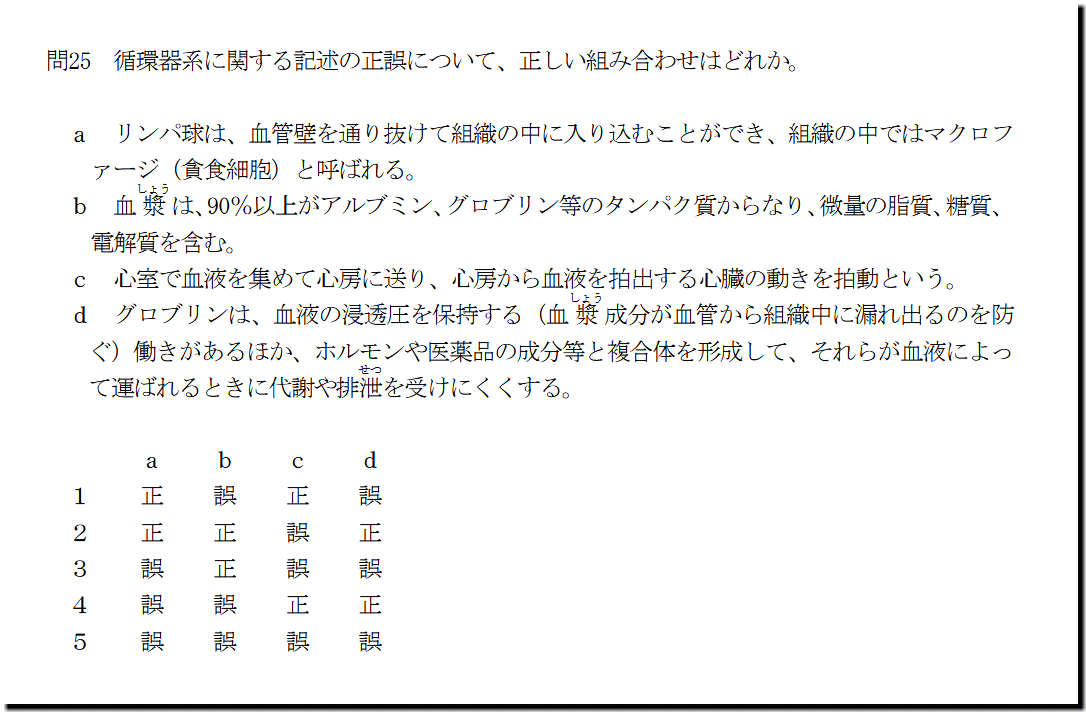 本問は、「人体」の「循環器系」についての出題です。基礎・基本的なものばかりなので、難しいところはありません。テキストと過去問を繰り返しておけば、まず、取れます。