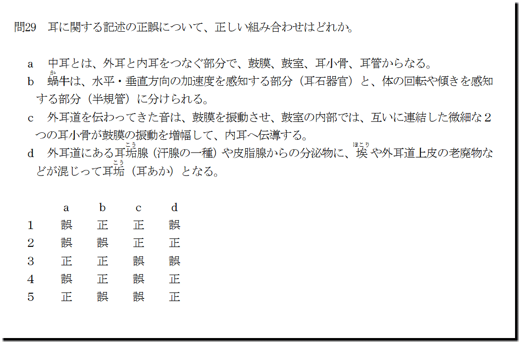 本問は、「人体」の「耳」の問題です。基礎・基本的なものばかりなので、難しいところはありません。テキストと過去問を繰り返しておけば、まず、取れます。