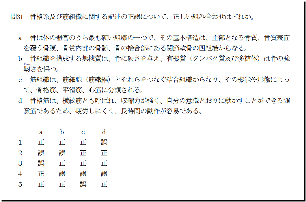 本問は、「骨格系及び筋組織」についての問題です。基礎・基本的なものばかりなので、難しいところはありません。テキストと過去問を繰り返しておけば、まず、取れます。