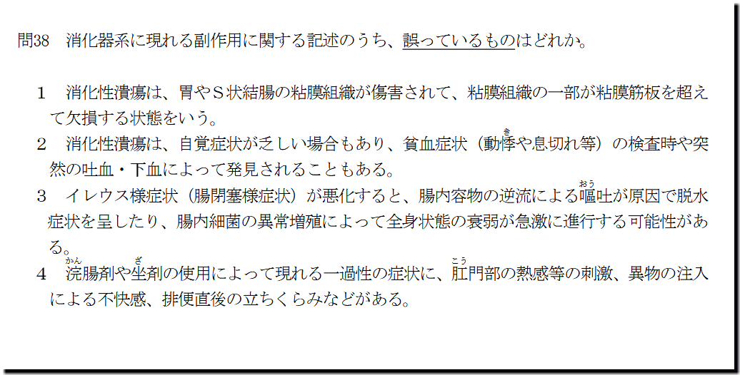 選択肢2の「消化性潰瘍は、自覚症状が乏しい場合もあり、貧血症状(動悸 や息切れ等)の検査時や突 然の吐血・下血によって発見されることもある。」ですが、正しい記述です。