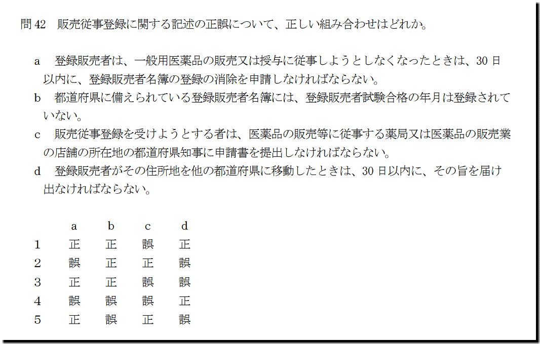 本問は、「法規」の「販売従事登録」の問題です。基礎・基本的なものばかりなので、難しいところはありません。テキストと過去問を繰り返しておけば、まず、取れます。