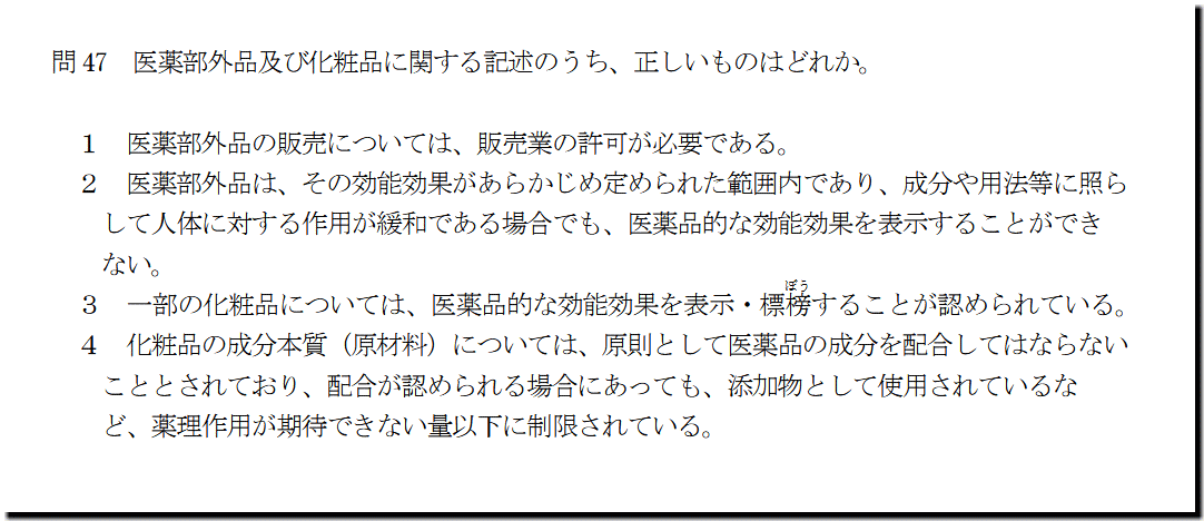 本問は、「法規」の「医薬部外品及び化粧品」についての問題です。基礎・基本的なものばかりなので、難しいところはありません。テキストと過去問を繰り返しておけば、まず、取れます。