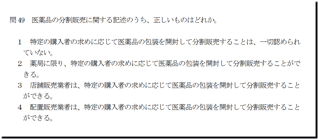 本問は、「法規」の「医薬品の分割販売」についての問題です。基礎・基本ばかりなので、難しくはありません。