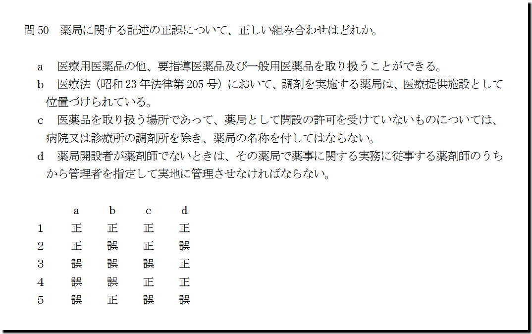 本問は、「法規」の「薬局」についての問題です。基礎・基本的なものばかりなので、難しいところはありません。テキストと過去問を繰り返しておけば、まず、取れます。