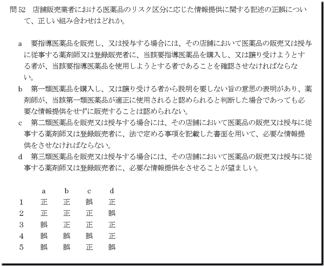 選択肢aの「要指導医薬品を販売し、又は授与する場合には、その店舗において医薬品の販売又は授与 に従事する薬剤師又は登録販売者に、当該要指導医薬品を購入し、又は譲り受けようとす る者が、当該要指導医薬品を使用しようとする者であることを確認させなければならな い。」ですが、誤った記述です。