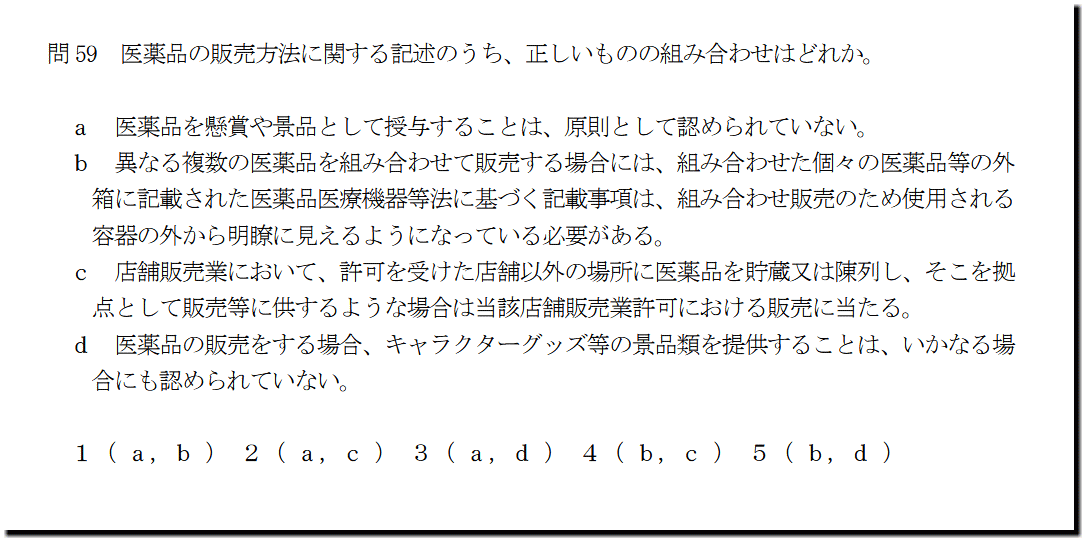 選択肢bの「異なる複数の医薬品を組み合わせて販売する場合には、組み合わせた個々の医薬品等の外 箱に記載された医薬品医療機器等法に基づく記載事項は、組み合わせ販売のため使用される 容器の外から明瞭に見えるようになっている必要がある。」ですが、正しい記述です。