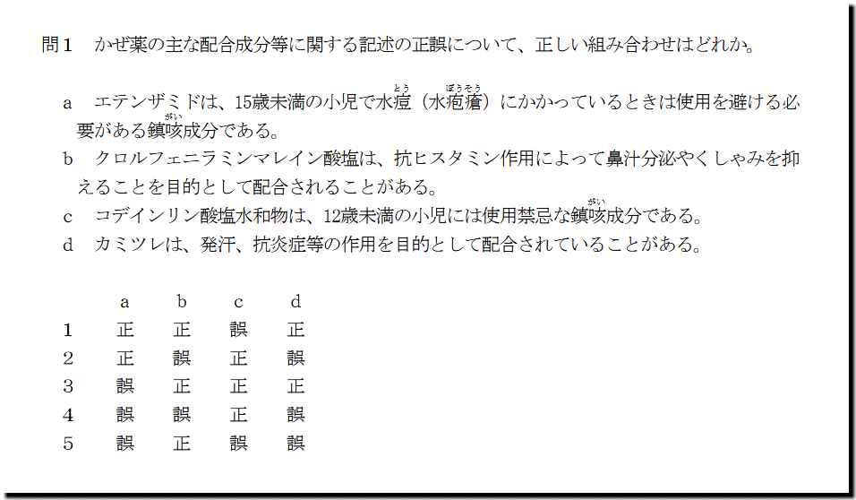 本問は、「医薬品」の「かぜ薬」についての問題です。生薬の選択肢が1つありますが、これ以外がすべて基礎・基本事項なので、最終解答は導けます。