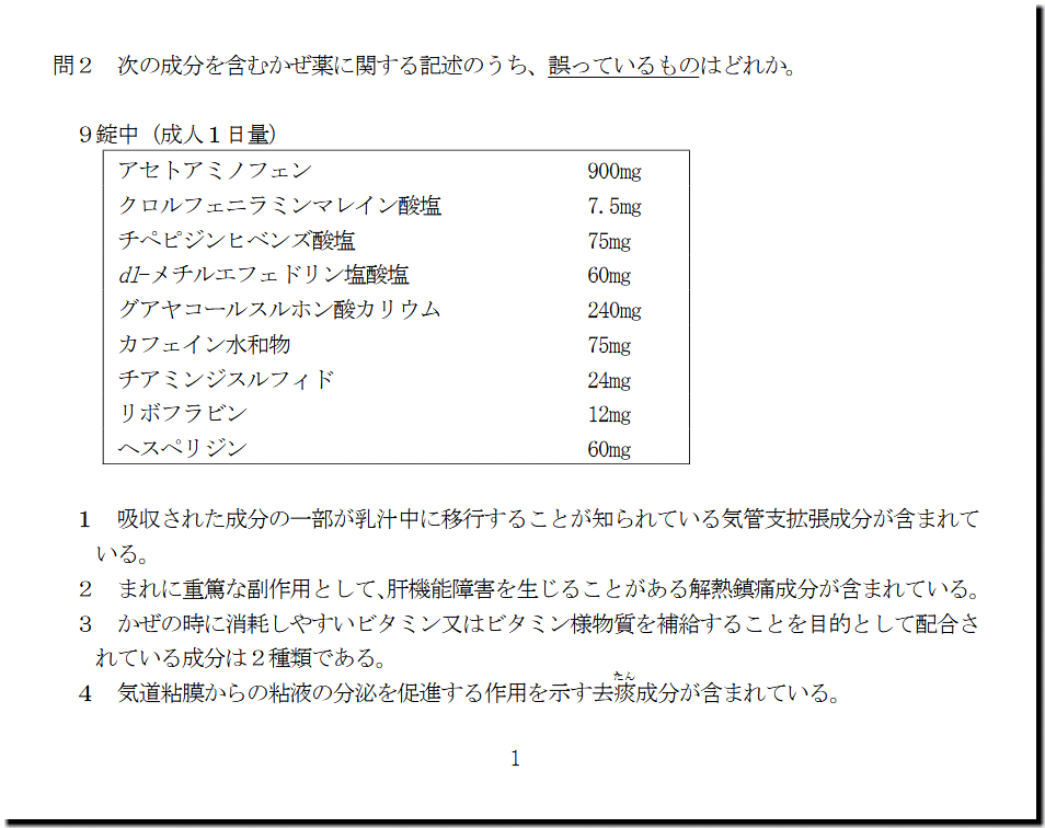 選択肢1の「吸収された成分の一部が乳汁中に移行することが知られている気管支拡張成分が含まれて いる。」ですが、正しい記述です。