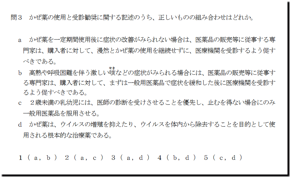 本問は、「医薬品」の「かぜ薬の受診勧奨」についての問題です。基礎・基本的なものばかりなので、難しいところはありません。テキストと過去問を繰り返しておけば、まず、取れます。