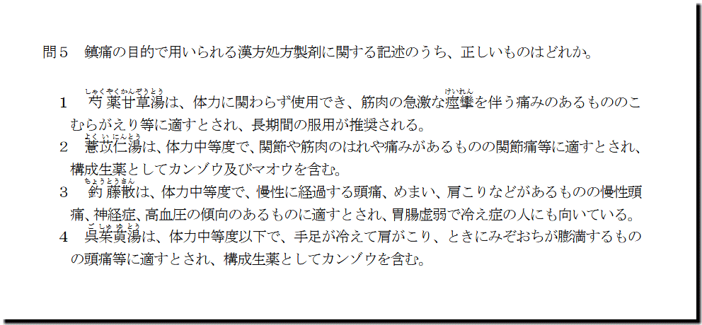 本問は、「医薬品」の「漢方処方製剤(鎮痛)」についての問題です。漢方処方製剤の選択肢が1つ、生薬の選択肢が1つあります。残りの選択肢は、基本レベルです。本問は、先の漢方処方製剤と生薬の選択肢うち、どちらかが正確に判別できないと、最終解答が合わない問題です。できる選択肢を解いたら、後は、運を天に任せましょう。