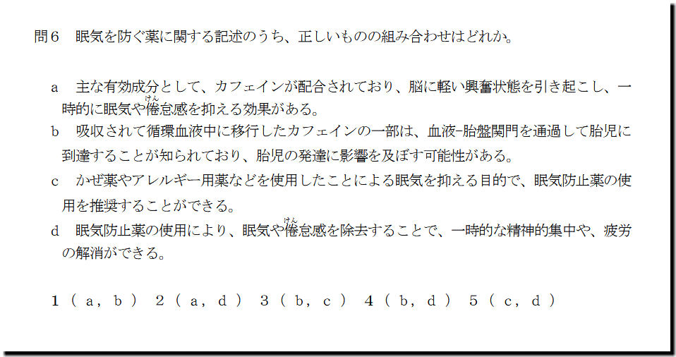 本問は、「医薬品」の「眠気防止薬」についての問題です。基礎・基本的なものばかりなので、難しいところはありません。テキストと過去問を繰り返しておけば、まず、取れます。