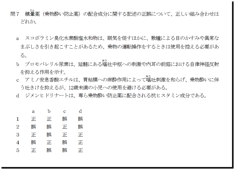 本問は、「医薬品」の「鎮暈薬(乗物酔い防止薬)」についての問題です。基礎・基本的なものばかりなので、難しいところはありません。テキストと過去問を繰り返しておけば、まず、取れます。