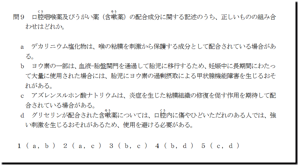 選択肢aの「デカリニウム塩化物は、喉の粘膜を刺激から保護する成分として配合されている場合があ る。」ですが、誤った記述です。