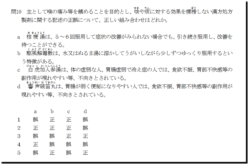 本問は、「医薬品」の「漢方処方製剤(鎮咳去痰)」についての問題です。特に難しいところはありません。テキストを読んで問題集を解いていれば、解けます。