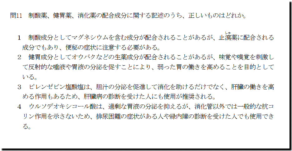 選択肢4の「ウルソデオキシコール酸は、過剰な胃液の分泌を抑えるが、消化管以外では一般的な抗コ リン作用を示さないため、排尿困難の症状がある人や緑内障の診断を受けた人でも使用でき る。」ですが、誤った記述です。