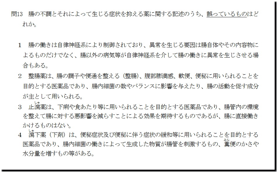 選択肢4の「瀉 下薬(下剤)は、便秘症状及び便秘に伴う症状の緩和等に用いられることを目的とする 医薬品であり、腸内細菌の働きによって生成した物質が腸管を刺激するもの、糞 便のかさや 水分量を増すもの等がある。」ですが、正しい記述です。