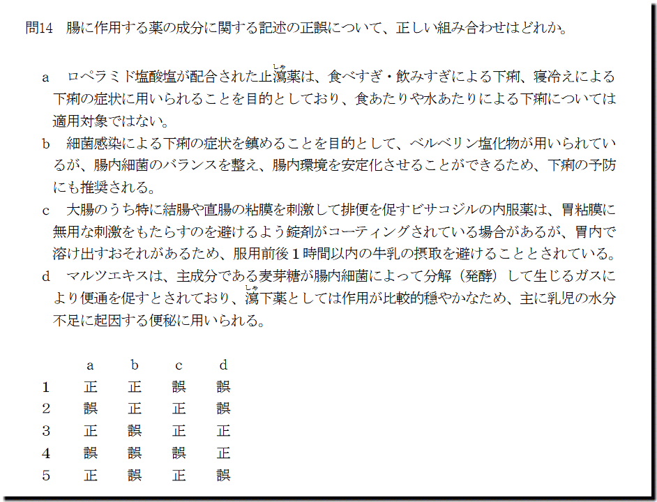 本問は、「医薬品」の「腸に作用する薬の成分」についての問題です。 生薬の選択肢が1つありますが、最終解答には影響しないので、大丈夫なはずです。他の選択肢は、基礎レベルなので、テキストと過去問を繰り返しておけば、まず、取れます。