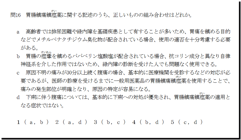 選択肢aの「高齢者では排尿困難や緑内障を基礎疾患として有することが多いため、胃痛を鎮める目的 などでメチルベナクチジウム臭化物が配合されている場合、使用の適否を十分考慮する必要 がある。」ですが、正しい記述です。