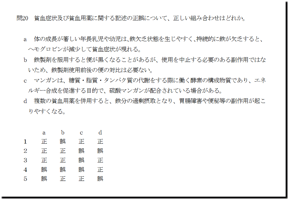 本問は、「医薬品」の「貧血症状及び貧血用薬」の問題です。基礎・基本的なものばかりなので、難しいところはありません。テキストと過去問を繰り返しておけば、まず、取れます。