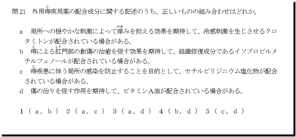 選択肢cの「痔 疾患に伴う局所の感染を防止することを目的として、セチルピリジニウム塩化物が配合 されている場合がある。」ですが、正しい記述です。