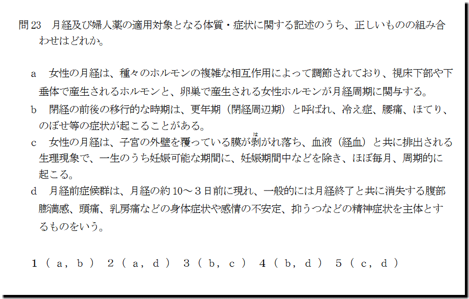 本問は、「医薬品」の「婦人薬の適用対象」の問題です。 すべての選択肢が漢方処方製剤なので、勉強していない人は、『お手上げ』です。本試験では、適当な数字をマークして、他の問題に勤しみましょう。