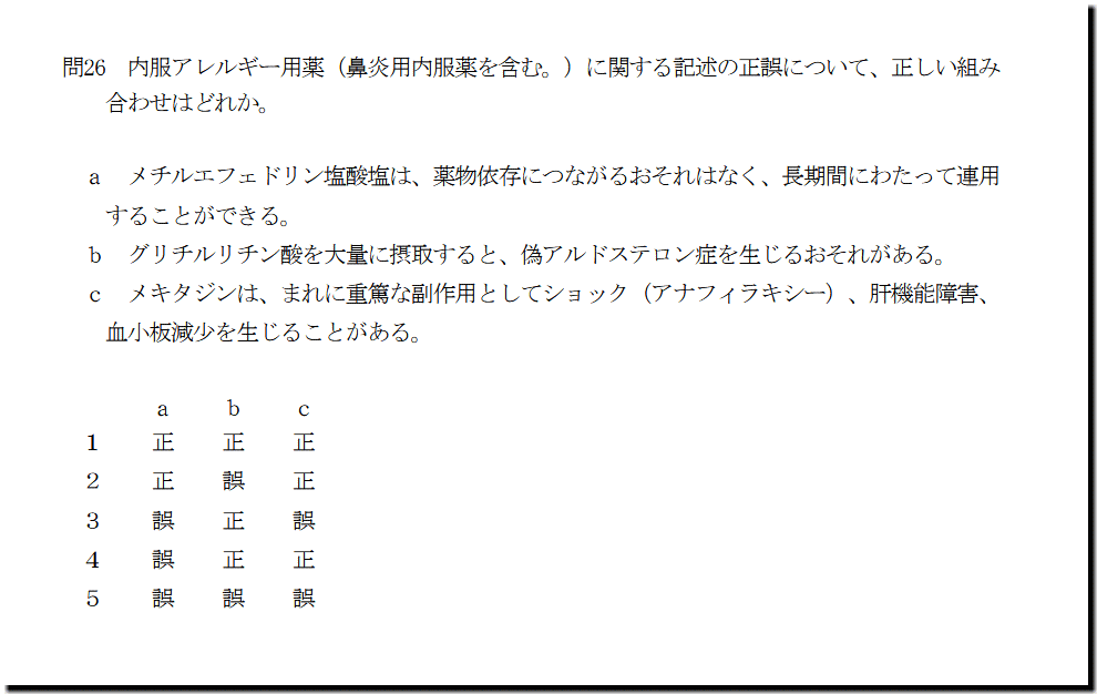 本問は、「医薬品」の「内服アレルギー用薬」についての問題です。難しいところはありません。基礎・基本事項ばかりの出題です。