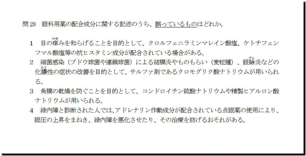 本問は、「医薬品」の「眼科用薬の配合成分」についての問題です。難しいところはありません。基礎・基本事項の出題です。