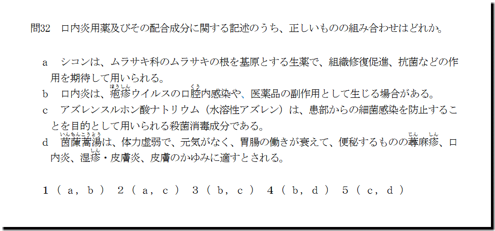 本問は、「医薬品」の「口内炎用薬」についての問題です。生薬と漢方処方製剤の選択肢が1つずつあります。そのうちどちらかができないと最終解答が出ないです。選択肢cがすごく簡単なんで、わからないときは運否天賦で解答しましょう。